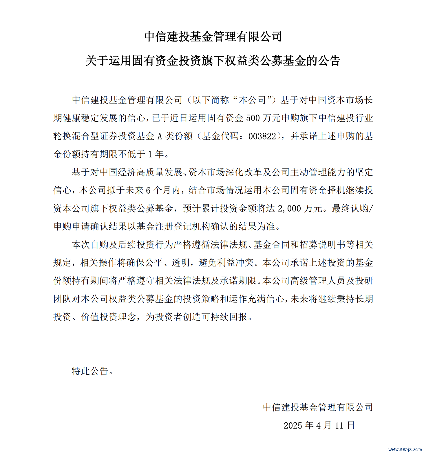 中信建投基金:拟2000万元自购旗下权益类公募基金