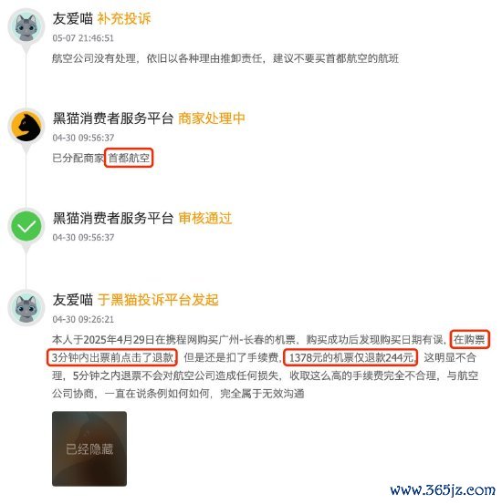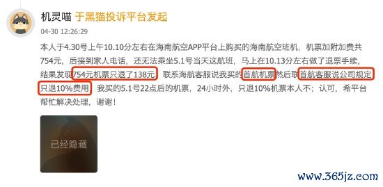 炒股配资资讯网 4月黑猫投诉航司领域红黑榜:首都航空754元机票只退138称公司规定只退10%